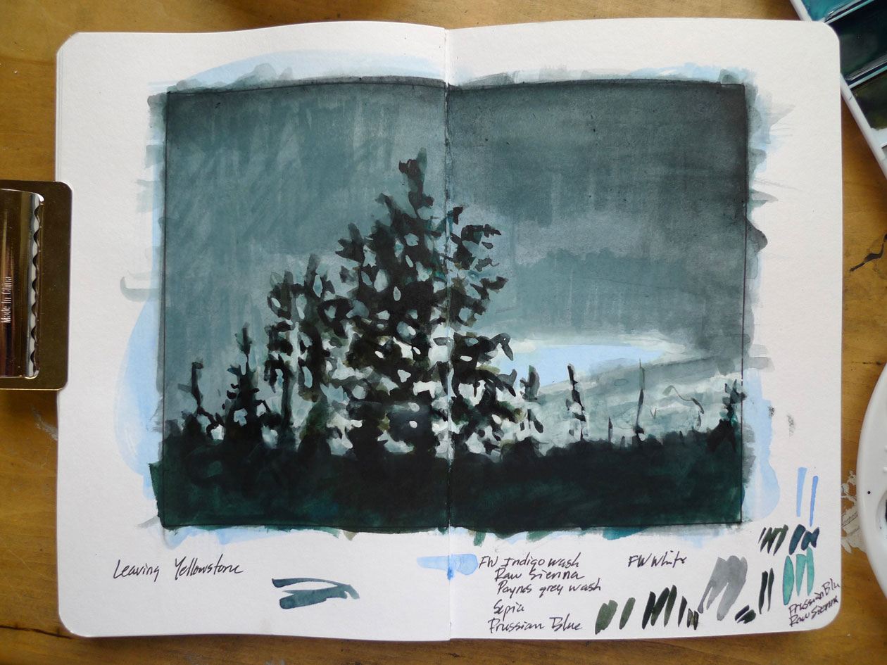 The finished painting will have an extreme level of contrast between the light of the sky and the back-lit, silhouetted shadows of the foreground. It is important to me that these seemingly flat, dark shapes possess a richness and depth to their color, as well as some unexpected varieties. Therefore, I will mix these darker values with color rather than rely on the use of straight black.